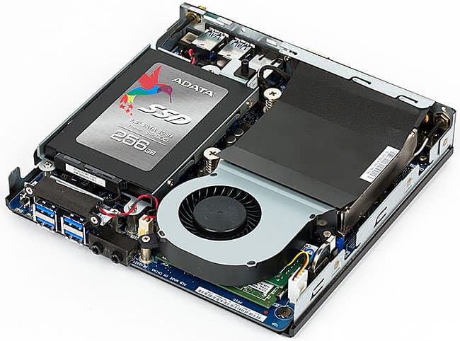 Малая высота корпуса заставила производителя использовать систему охлаждения, подобную ноутбукам и мини-ПК: компактный радиатор и продувающий его вентилятор-турбина (кстати, в серверах обычно подход такой же, только вместо турбин — «обычные» вентиляторы, да и диаметром побольше). Отметим, что в «нукообразных» системах подобного ранее не хватало на процессоры с TDP 65 Вт, да и при 28 Вт проблемы были возможны, поэтому изначально мы отнеслись к конструкции немного скептически. Отдавая себе, впрочем, отчет в том, что здесь собственно объем корпуса больше примерно в полтора раза, причем процессор (в отличие от NUC и им подобных) не «загнан» в маленький «закуток» в корпусе, так что эффективность работы СО может оказаться существенно выше. Как бы то ни было, найти точный ответ на этот вопрос без тестирования невозможно, так что мы его провели.