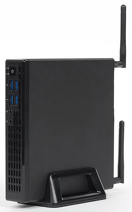 Такой подход позволяет щедрой рукой отсыпать системе всех необходимых разъемов. В частности, на лицевой панели есть целых четыре порта USB 3.0, чем может похвастаться редкий десктоп. Также здесь разместились разъемы для наушников и микрофона, а вот картовода нет. Судя по всему, компания сочла, что при отсутствии в процессоре/чипсете встроенной поддержки SD/MMC (в отличие от Atom) его все равно пришлось бы «вешать» на USB, которых здесь по сравнению с традиционными мини-ПК много, так что лучше пусть уж покупатель приобретет себе внешнюю модель, причем такую, какая ему в наибольшей степени подходит.