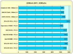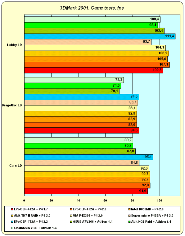 Мы приводим в диаграммах только результаты тестирования при низкой детализации для игровых тестов Cars, Dragothic, и Lobby, а также общий балл, который присваивает сам тест 3DMark 2001. Дело в том, что результаты для тестов с высокой детализацией и игрового теста Nature просто-напросто не подходят для сравнения производительности процессоров и чипсетов. Так, тесты с высокой детализацией, демонстрируют ту же картину, только с уменьшенной "контрастностью", а тест Nature просто-напросто отказывается реагировать на изменение частоты процессора или смену чипсета — видимо, все в данном случае решающее значение приобретает производительность видеосистемы.