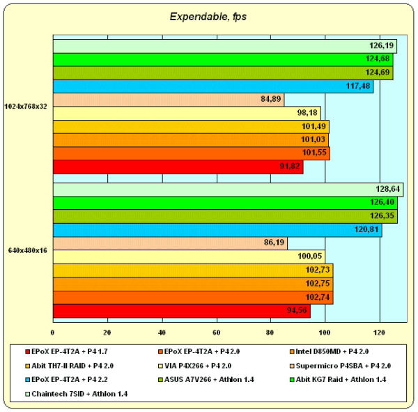 Замечательный, даже мы бы сказали "классический" пример приложения, на котором у Pentium 4 нет ну просто-таки никаких шансов на выигрыш даже в обозримом будущем. Даже разогнанный Pentium 4 2.2 GHz не изменяет общей картины: все, чего ему удалось достичь — это немного приблизиться к результатам Athlon 1.4 GHz. Даже ничего не зная о Expendable (а мы-то знаем, что на самом деле все обстоит именно так), чрезвычайно легко предположить основную причину проигрыша процессора Intel: "хаотичный" код, который чрезвычайно нелюбим процессором с длинным конвейером. Ну что еще можно сказать? Да, есть такие приложения. Либо они "вымрут" если производители ПО начнут учитывать существование такого процессора как Pentium 4 со всеми его специфическими особенностями внутренней архитектуры… либо будут появляться по-прежнему, если этот CPU не приобретет большой популярности. Делать в данном случае прогнозы — дело тяжкое и неблагодарное, поэтому ограничимся просто констатацией факта.