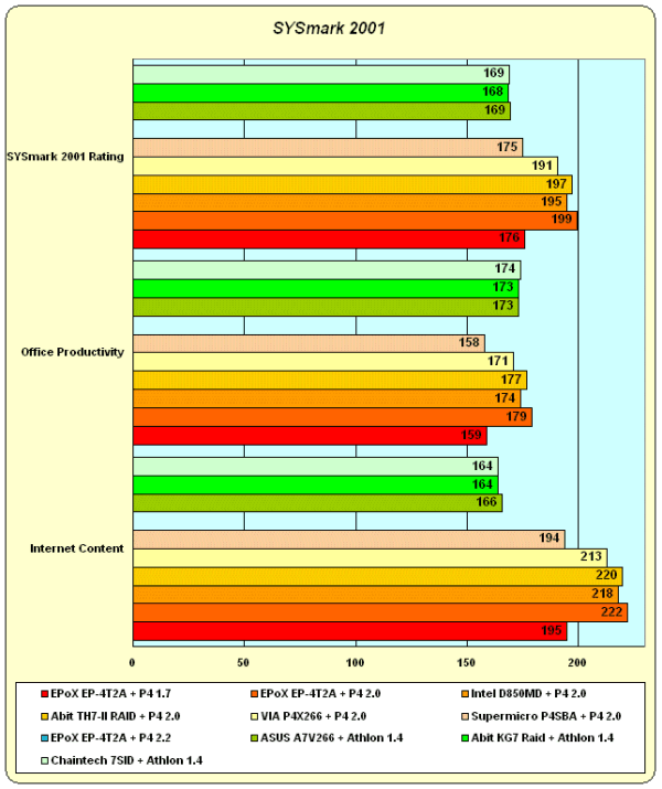 Пожалуй, единственный тест, где недавно нами "пожуренный" i845 в одном из подтестов даже обогнал все системы на базе процессора AMD. О Pentium 4 на i850 и P4X266 и говорить нечего — они выигрывают, и с впечатляющим отрывом. SYSmark 2001 — яркий образец высокой концентрации приложений "новой волны", в которых поддержка SSE/SSE2 присутствует чуть ли не в качестве обязательного параметра, и это, как легко заметить из диаграммы, дает вполне определенный (и легко предсказуемый!) результат. Причем разогнанный Pentium 4 2.2 GHz показывает — дальше "старым" процессорным архитектурам в подобных приложениях будет еще хуже :)