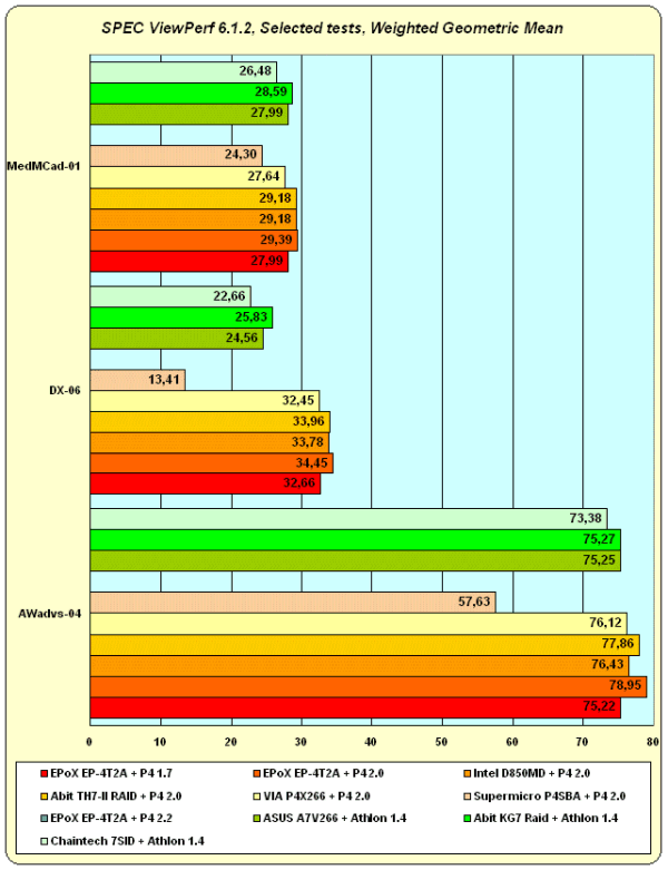 Мы не будем делать большого события из выигрыша одной системы по отношению к другой на мизерные проценты. Поэтому можно сказать, что в AWadvs и MedMCAD системы на базе Athlon 1.4 GHz и Pentium 4 2 GHz показывают примерно одинаковую производительность. DDR-система на основе VIA P4X266 практически везде немного отстает от своих аналогов на i850, но это отставание нельзя назвать существенным.