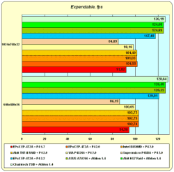 Диаграмма с fps в игровых тестах дает довольно забавную картину: если в Cars и Lobby общая схема распределения производительности между процессорами и чипсетами примерно соответствует результатам на диаграмме с общим баллом (3DMarks), то результаты в Dragothic вызывают небольшое недоумение — да системы на, Pentium 4 по-прежнему впереди, но их производительность между собой практически не различается! Один из возможных вариантов с нашей точки зрения может выглядеть так: на самом деле Dragothic, как и исключенные нами подтесты, не зависит от производительности процессора и подсистемы памяти, но зато он зависит от факта наличия поддержки определенных команд этим процессором. Напомним, что ни SSE, ни SSE2, обычные Athlon не поддерживают.