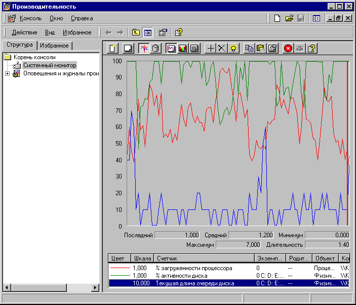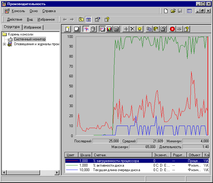 Пуск —> Настройка —> Панель Управления —> Администрирование —> Системный Монитор. (В Windows 9x Системный Монитор тоже есть, но попроще, ищите его в меню служебных программ.) Теперь вызываем контекстное меню посередине появившейся консоли, выбираем в нем пункт «Добавить счетчики» и добавляем три следующих счетчика: счетчик загруженности процессора (объект: процессор), счетчик активности диска (объект: физический диск) и счетчик текущей длины очереди диска (объект тот же). Добавив все необходимые счетчики, мы возвращаемся в главное окно Системного Монитора, нажимая клавишу «Закрыть». Клавиша «Объяснения» выдает короткую справку по текущему счетчику производительности — обращайтесь к ней всякий раз, когда встретитесь с чем-то непонятным.