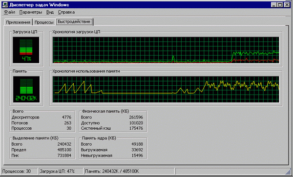 Графа «Выделенная память» как раз и отражает количество выделенной, то есть зарезервированной памяти, но не дает прямого ответа на вопрос, используется эта память или нет. Для прояснения ситуации следует обратиться к графе «Физическая память», содержащей среди прочей информации доступный объем оперативной памяти. Чем он больше — тем лучше. Считается, что если свободно хотя бы 50 или 100 мегабайтов физической памяти, то потребности системы в ней полностью удовлетворены. На самом деле, это предположение в коре неверно. Если перед обращением к Диспетчеру Задач вы завершите какое-нибудь «монстроидальное» приложение, то вся занятая им память окажется свободной и будет оставаться таковой, пока вы не переключитесь на приложение, полностью или частично «высвопленное» на диск. Наглядное доказательство тому приведено ниже (см. рис). Смотрите: в системе установлено 256 МБ памяти, из них 235 МБ выделено, а 98 МБ — свободно. Согласитесь, что 235 + 98 > 256! Поэтому следует опираться не на текущее, а на минимальное количество свободной физической памяти. Держите глаза широко раскрытыми и периодически поглядывайте на Диспетчер Задач в ходе работы с другими приложениями.