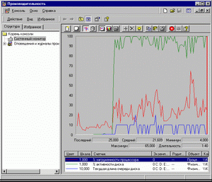 «Процесс пошел!» — как говорят в Одессе. Системный Монитор начинает протоколирование, процарапывая на экране три кривые. Зеленая отвечает за загруженность диска, красная — за загруженность ЦП, голубая — за длину очереди запросов на диск (разумеется, такие цвета кривым назначаются по умолчанию — они могут быть изменены вручную и будут перепутаны, если вы добавляли счетчики в ином порядке).