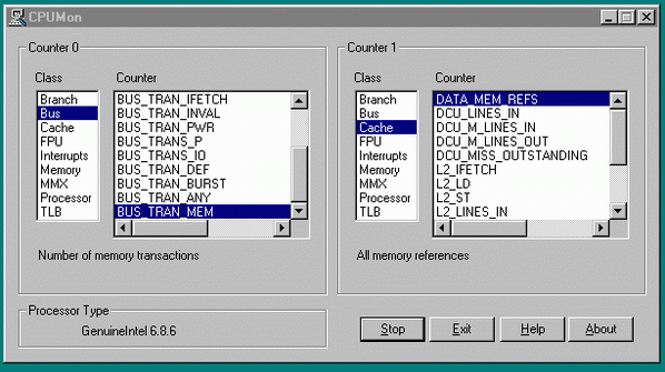 Как мы будем действовать? В окне «Class» счетчика 0 мы выбираем «Bus» (шина), а в окне «Counter» — BUS_TRAN_MEN. Этот счетчик будет отслеживать количество обращений к памяти, пропущенных через шину. Для счетчика 1 в окне «Class» мы выберем «Cache» (кэш), а в окне «Counter» — DATA_MEM_REFS. Этот счетчик будет фиксировать общее количество обращений к памяти.