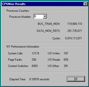 Разобраться с ней несложно (не забудьте только, что под Windows NT она требует наличия прав администратора). В окне «Class» мы выбираем интересующий нас класс событий, а в окне «Counter» указываем, какое из событий мы, собственно, хотим считать. И так — для обоих счетчиков.