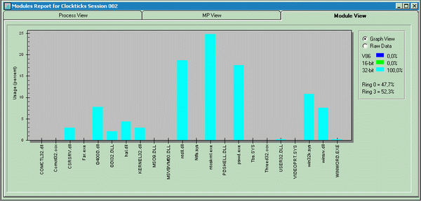 Пример результатов профилировки одного из приложений приведен ниже. По вертикальной оси откладывается время, проведенное процессором в каждом из модулей системы, а по горизонтальной располагаются сами модули. Как видно, львиная доля общего времени выполнения приходится на ядро (~25%), за ним с небольшим отрывом следует системная библиотека NTDLL.DLL и прикладной процесс парольного переборщика PSWD.EXE (~20% и 18% соответственно). Доля влияния графической подсистемы в лице библиотеки G400.DLL (Matrox Millennium G450 Dual Head, для справки) составляет менее 5% и со всей очевидностью ни в какой оптимизации не нуждается. Драйвер файловой системы: — NTFS.SYS — не отнял вообще ни одного процента времени, значит, быстродействие жесткого диска в данном случае также некритично.