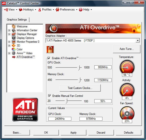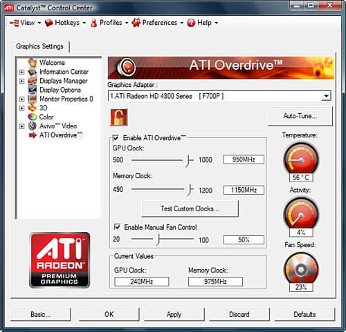 Разгон осуществлялся средствами драйвера Catalyst 9.5, через входящую в его состав утилиту Overdrive. Здесь также присутствует функция автонастройки, но она заявила, что 865/975 — это предел для данной видеокарты. Мы ей, конечно же, не поверили :). Постепенное увеличение частот ядра и памяти с последующей проверкой на стабильность позволили разогнать Radeon 4890 до уровня 950/1150 МГц по ядру и памяти соответственно. Скорость вентилятора была вручную установлена на 50%, при повышении скорости до максимума стабильными становились лишь частоты 955/1155 МГц, зато вой стоял настолько невыносимый, что мы решили пожертвовать этим незначительным приростом.