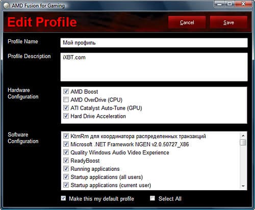 Редактировать встроенные профили нельзя, зато можно создавать свои из набора имеющихся в наличии пунктов. Для теста мы создали свой профиль, включив в него все составляющие, за исключением AMD Overdrive.