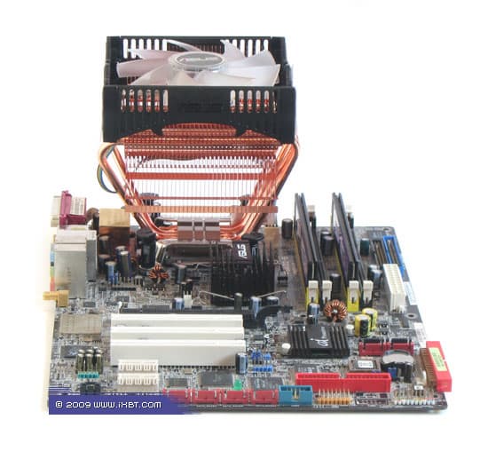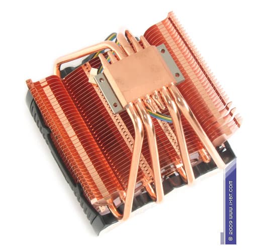 Конструктивные особенности (радиатор). «Рабочее тело» кулера образовано комбинацией медного теплосъемника 40х30х7 мм, 6 медных тепловых трубок диаметра 6 мм и секции медного оребрения (38 пластин усложненной формы, общая площадь поверхности теплообмена порядка 4500 см2).