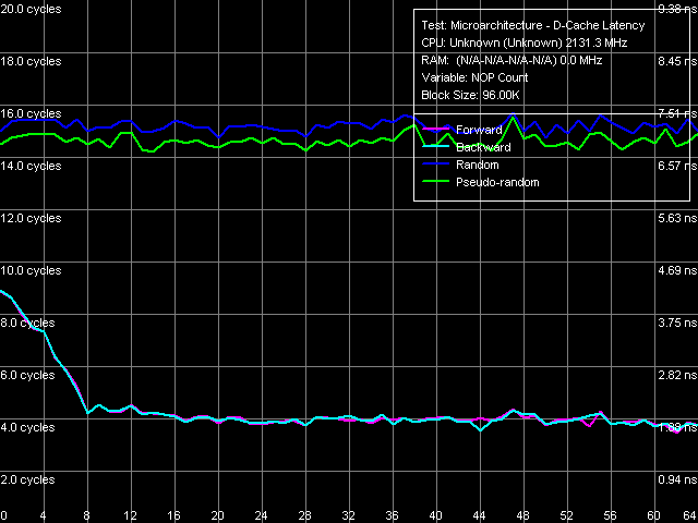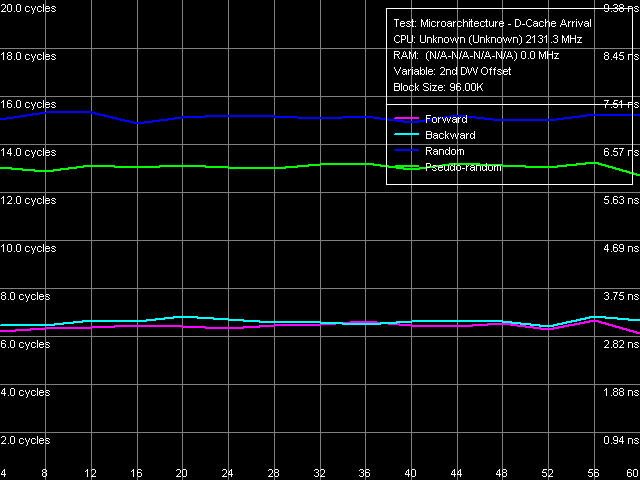 | RAM (32-МБ блок), размер шага 128 байт | 87.4 нс (прямой) 87.4 нс (обратный) 87.6 нс (псевдослучайный) 107.2 нс (случайный) | < 15.3 нс (прямой) < 15.4 нс (обратный) 65.6 нс (псевдослучайный) 88.5 нс (случайный) |