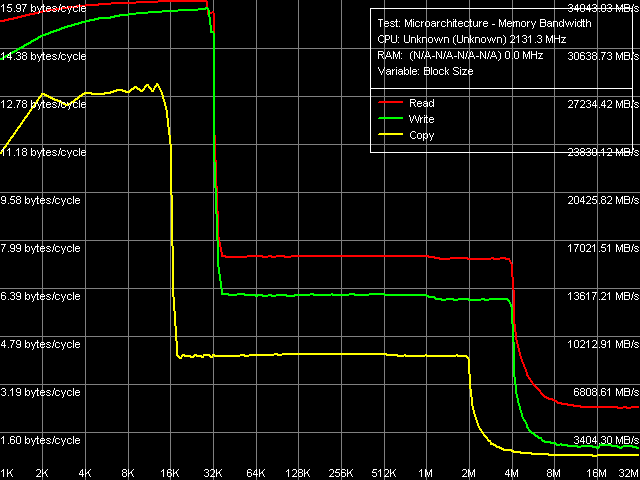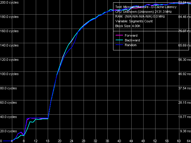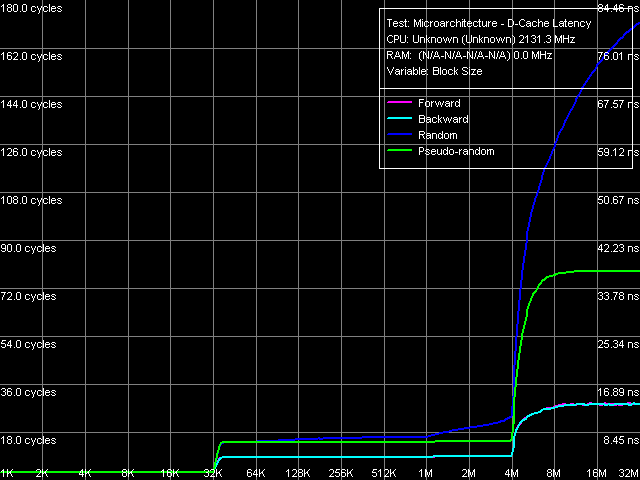 | RAM (32-МБ блок), размер шага 128 байт | 92.2 нс (прямой) 90.0 нс (обратный) 92.2 нс (псевдослучайный) 108.6 нс (случайный) | 32.7 нс (прямой) 31.8 нс (обратный) 68.2 нс (псевдослучайный) 89.3 нс (случайный) |