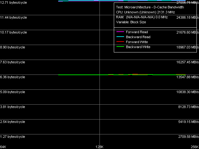 | RAM (32-МБ блок), размер шага 64 байта | 24.0 нс (прямой) 24.0 нс (обратный) 49.1 нс (псевдослучайный) 98.0 нс (случайный) | 13.4 нс (прямой) 13.5 нс (обратный) 36.9 нс (псевдослучайный) 80.6 нс (случайный) |