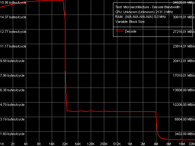 На рис. 12 показана кривая эффективности декодирования/исполнения крупных 6-байтных инструкций «CMP 3» (cmp eax, 00000000h), как наиболее показательных в плане абсолютной скорости их обработки. По этому результату уже можно оценить предельную скорость выборки инструкций декодером из L1-кэша инструкций — она составляет 16 байт/такт, что выше по сравнению с результатом, демонстрируемым Yonah (12 байт/такт, см. таблицу 7). Предельная скорость исполнения кода из унифицированного L2-кэша составляет 3.83 байт/такт, что несколько выше по сравнению с Yonah (3.71 байт/такт). Кстати, заметим, что объем L2-кэша и в этом случае (при исполнении сверхдлинного блока кода) целиком предоставляется одному, активному ядру.