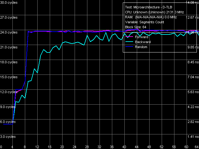 По представленным на рис. 8 результатам измерения можно вполне подтвердить заявленные производителем значения. Небольшое увеличение латентности при превышении 4 сегментов может свидетельствовать об исчерпании ассоциативности D-TLB, стабильный же результат исчерпания ассоциативности L1/L2-кэша наблюдается в области 8 и 16 сегментов, соответственно.