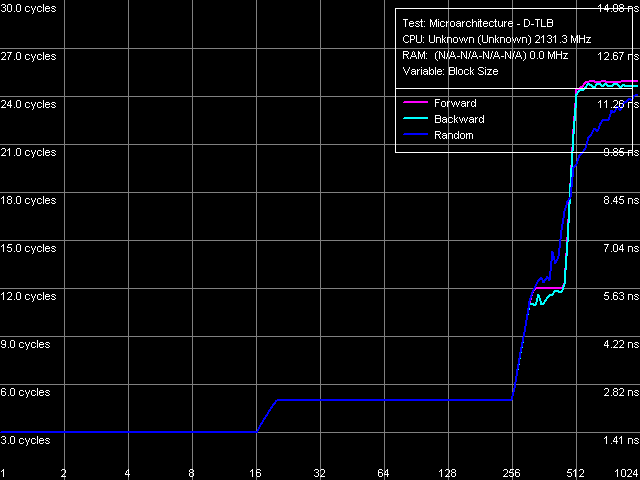 Напоследок, оценим размер и ассоциативность буферов трансляции адресов (TLB) данных и инструкций. При исследовании характеристик CPUID ядра Conroe мы уже отмечали, что, сколь бы странным это не выглядело, данные буферы, по-видимому, претерпели некоторые изменения, поскольку большинство дескрипторов, описывающих характеристики этих буферов, не соответствуют каким-либо известным TLB предыдущих процессоров Intel.