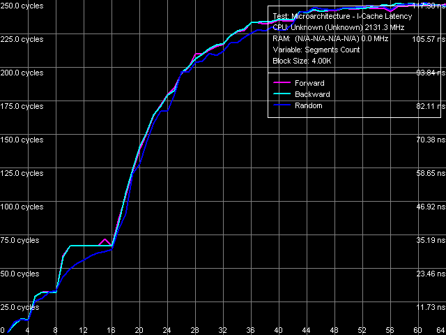 Картина ассоциативности кэша инструкций (рис. 14) оказывается не менее четкой, чем рассмотренная выше картина ассоциативности кэша данных. Наблюдаемый перегиб в области 4 сегментов, по-видимому, вновь относится к ассоциативности TLB (на сей раз — I-TLB), тогда как перегибы в области 8 и 16 сегментов соответствуют заявленной ассоциативности L1- и L2-кэшей.
