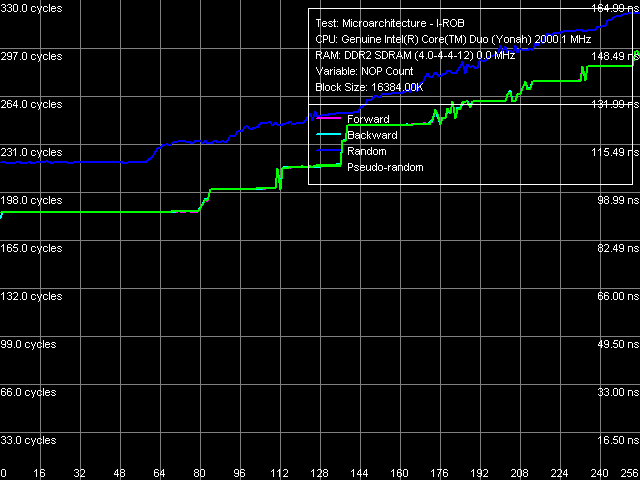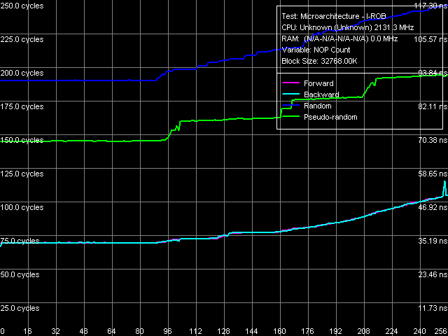 Напомним принцип работы специального теста RMMA, позволяющего оценить глубину буфера переупорядочивания инструкций (I-ROB): запускается одна простая, но долго исполняемая инструкция — операция зависимой загрузки последующей строки данных из памяти, mov eax, [eax], а сразу вслед за ней — серия очень простых, не зависящих от нее операций (NOP). В идеализированном случае, как только время исполнения такой связки начинает зависеть от количества NOP-ов, можно считать, что размер I-ROB исчерпан.