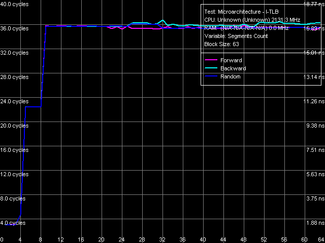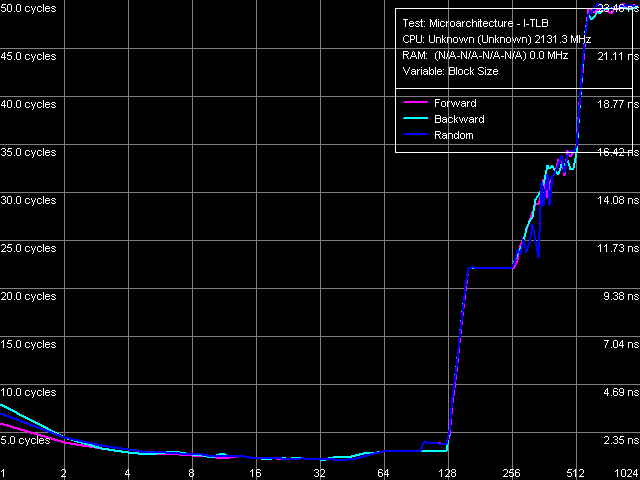 Перейдем к тестам I-TLB. К счастью, дескриптор последнего известен и соответствует 128-страничному буферу со степенью ассоциативности, равной 4. Его размер в соответствующем тесте (рис. 19) определяется достаточно четко и действительно составляет 128 записей. Промах этого буфера «обходится» процессору примерно в 20 тактов (такое же значение наблюдается у процессоров класса Pentium M).