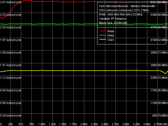 Сопоставляя внешний вид кривых зависимости ПСП от дистанции предвыборки на ядрах Yonah (рис. 2) и Conroe (рис. 3) можно заметить некоторые отличия в ее реализации. Так, на ядре Yonah максимум эффективности программной предвыборки при чтении данных наблюдается при ее дистанции в 192 байта и более-менее сохраняется в интервале 192-384 байт, после чего заметно снижается. При копировании данных эффективность предвыборки плавно возрастает при увеличении ее дистанции вплоть до 4096 байт, т.е. до границы страницы запрашиваемых данных. В то же время, на ядре Core наблюдается иная картина: максимум эффективности программной предвыборки при чтении наблюдается при ее дистанции примерно в 640 байт, после чего сохраняется практически на постоянном уровне. А операции копирования вообще оказываются гораздо менее чувствительными к программной предвыборке как таковой.