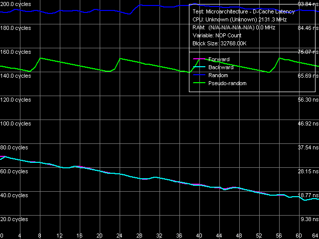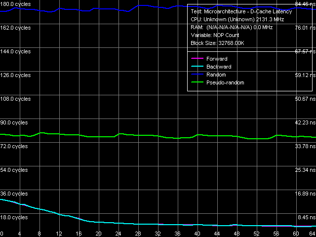 Как видно по рис. 5, ожидаемое согласуется с действительным. Уже при вставке 8 пустых операций (NOP) латентность L2-кэша при прямом и обратном вариантах обхода снижается до минимальной отметки в 4(!) такта процессора. Посмотрим, какую латентность мы сможем достичь, применяя аналогичный подход, но уже при доступе к данным. Для начала, сохраним размер шага в 64 байта, отвечающий максимальной эффективности аппаратной предвыборки (рис. 6).