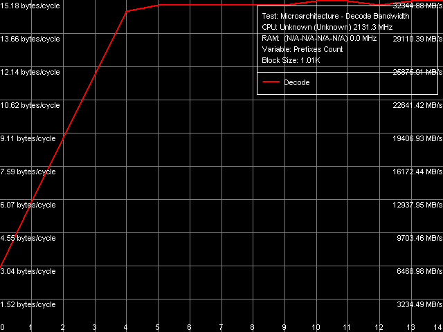 Заметим, что новое процессорное ядро Conroe с таким же успехом, как и Yonah, способно справляться с «условными зависимостями» в цепочке инструкций SUB (sub eax, eax), XOR (xor eax, eax) и XOR/ADD (xor eax, eax; add eax, eax) — эффективность исполнения таких цепочек не уступает эффективности исполнения цепочек независимых простейших инструкций (NOP, TEST, CMP). В то же время, отсечение бессмысленных префиксов по-прежнему не отличается столь же высокой эффективностью, которую можно наблюдать в процессорах микроархитектуры NetBurst. Тем не менее, определенные подвижки в этом направлении (пусть и далеко не столь значимом) все же имеются. Во-первых, темп исполнения «префиксных CMP» ядром Conroe несколько увеличился (с 2.0 до 2.29 байт/такт) по сравнению с ядром Yonah. Во-вторых, посмотрим на результаты теста декодирования/исполнения «префиксных NOP» — инструкций вида [66h]nNOP, n = 0..14, представленные на рис. 13 и в таблице 8.