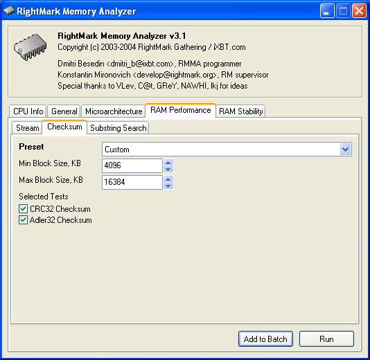 В первом из этих тестов (Checksum) осуществляется вычисление контрольных сумм CRC32 и Adler32 по алгоритмам, реализованным Марком Адлером (Mark Adler) в библиотеке zlib. Параметры этого теста — минимальный (Min Block Size, KB) и максимальный (Max Block Size, KB) размер блока, выбор способов тестирования (Selected Tests — CRC32 Checksum и Adler32 Checksum). По умолчанию этим тестом используются большие объемы данных, заведомо превышающие размер кэша данных процессора.
