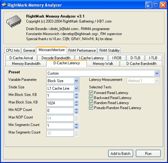Как уже было сказано выше, этот тест, по сути, является одним из вариантов теста латентности кэша данных (D-Cache Latency), вынесенным в отдельную закладку с целью упрощения его настроек. Параметры этого теста следующие.