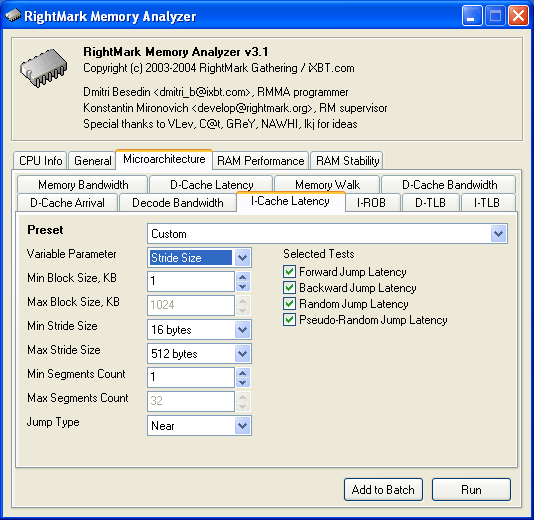 В этот тест, напротив, была добавлена новая разновидность (Variable Parameter = Stride Size), позволяющая строить зависимость латентности исполнения инструкций перехода по цепочке от величины шага между двумя последующими переходами. Данная опция может быть полезна для измерения «эффективной» длины строки кэша инструкций.