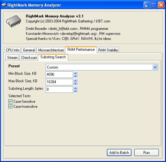 Второй из новых тестов производительности подсистемы памяти (Substring Search) представляет собой простую реализацию задачи поиска подстроки текста заданной длины (параметр Substring Length, bytes) в текстовом массиве большого размера (границы которого задаются параметрами Min Block Size, KB и Max Block Size, KB). В данной версии теста массив «текста» представляет собой массив случайных символов, попадающих в интервал (0x20 — 0x7F), т.е. типичных для текста, состоящего из цифр, заглавных и прописных латинских букв, знаков пунктуации и т.п., а «подстрока» представляет собой фрагмент текста, составленный из названия программы. Для примера, подстрока длиной 64 символа будет выглядеть следующим образом: