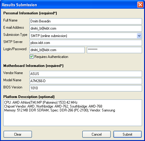 Реализованные на данный момент способы отправки информации — это так называемая offline submission (в этом случае результаты просто сохраняются в файл с именем, основанным на e-mail адресе пользователя, после чего пользователю предоставляется возможность отправить этот файл вручную в виде вложения по адресу базы данных, указанному в программе), а также online SMTP submission (в этом случае сохраненные в файле результаты автоматически отправляются по адресу базы данных, после чего программой сообщается успешность выполнения операции). В дальнейшем планируется реализация online-отправки по протоколу HTTP, с автоматическим приемом результатов теста HTTP-сервером базы данных проекта RightMark.