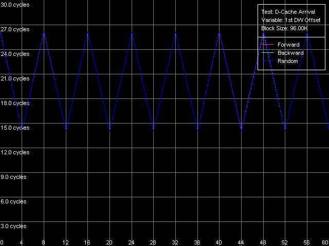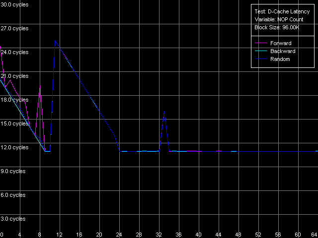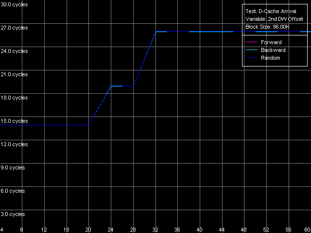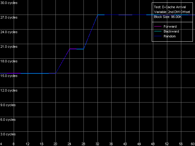 На рисунках изображена зависимость суммарной латентности двойного обращения от смещения второго обращения (в байтах) относительно первого. Видно, что в данном случае (при достаточной разгрузке шины введением 64 «NOP»-ов между двумя последующими обращениями к соседним строкам кэша) кривые последовательного прямого, обратного и случайного доступа оказываются вырожденными. При смещениях 2-го элемента строки в пределах 4-20 байт относительно первого суммарная латентность двух обращений составляет 14/15 тактов (для K7/K8, соответственно), что в точности соответствует доступу в L2 кэш (11/12 тактов) с последующим доступом в L1 кэш (3 такта). В то же время, возрастание общей латентности при величине смещения 24 байт и выше, связано с тем, что предельная теоретическая пропускная способность двунаправленной 64-битной шины L1-L2 процессора AMD Athlon XP на чтение, составляет величину 8 байт/такт (за 3 такта обращения, связанных с доступом в L1, из L2 может прибыть не более, чем 8x3 = 24 байт данных). Довольно неожиданным является такое же поведение процессора Opteron, означающее, что эффективная разрядность шины L1-L2 на чтение составляет всего 64 бита. Более подробно это рассматривалось в приложении 1 к статье, посвященной детальному исследованию архитектуры AMD64.