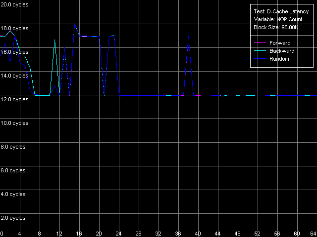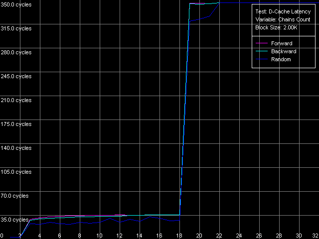Заслуживает внимания вид кривых обратного и случайного доступа. Возникновение «зубчиков» связано с тем, что новый цикл обмена с памятью может стартовать/заканчиваться только на целом числе тактов системной шины. Как можно видеть, в данном случае «зубчики» расположены с интервалом в 23 «NOP»-а. Это означает, что цикл обмена с памятью в рассматриваемой системе (с коэффициентом умножения, равным 1533.3/133.3 = 11.5) может осуществляться только на каждом четном (либо нечетном) такте шины памяти. Причина такого поведения некоторых платформ AMD K7 пока что остается невыясненной. Отметим лишь, что это не связано с двухпроцессорной конфигурацией тестируемой системы, а также не зависит от типа используемой памяти (DDR или SDRAM) и является, по всей видимости, особенностью реализации того или иного чипсета.