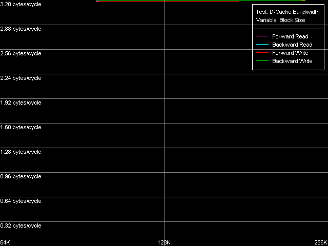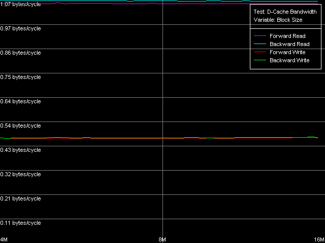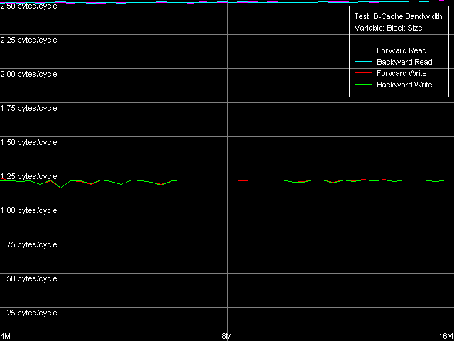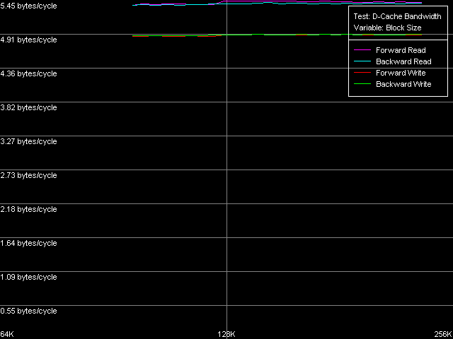 Средняя реальная пропускная способность кэша L1, точнее, связки L1-LSU, на чтение в обоих случаях (12.8 байт/такт, K7 и 14.2 байт/такт, K8) немного не дотягивает до теоретического максимума 16 байт/такт. Последний соответствует 128-битной шине данных между L1 и LSU (Load-Store Unit), заявленной в документации AMD (два 64-битных порта). Эффективность L1 на запись гораздо (а именно, в два раза) ниже, что позволяет предположить использование лишь одного такого порта при операциях записи данных.