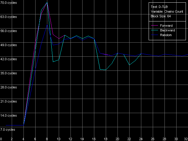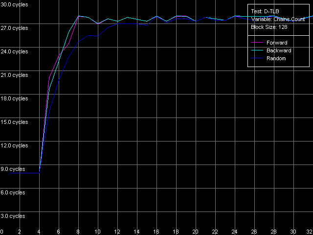 Проверка подтверждает: латентность доступа в L1 кэш при обращении к 16 страницам памяти у обоих процессоров остается равной 3 тактам при любом количестве зависимых цепочек доступа. Такой же вид кривых можно получить и при максимальном количестве цепочек, равным 32. Это означает, что L1 TLB является полностью ассоциативным (поскольку степень его ассоциативности оказывается не меньшей, чем его собственный размер).