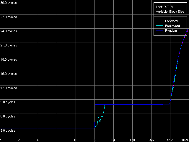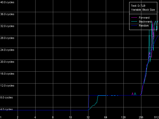 Мы видим, что оба рассматриваемых процессора имеют двухуровневую систему D-TLB, с размером L1 D-TLB, равным 32 записям. Размер L2 D-TLB у Athlon XP составляет 256 записей, а в Opteron его увеличили ровно в 2 раза (512 записей). Поскольку второй скачок наблюдается в области, соответствующей размеру L2 D-TLB, а не общему объему L1+L2 D-TLB, можно предположить, что структура D-TLB обоих процессоров имеет «инклюзивную» организацию (к сожалению, обычно детали организации уровней TLB при наличии нескольких таких уровней никак не отражаются в документации). В обоих случаях, промах L1 D-TLB сопровождается увеличением латентности доступа в L1 кэш до 8 тактов. Промах L2 D-TLB сказывается существенно сильнее — по мере увеличения количества промахов латентность доступа в L1 кэш плавно возрастает до значений, явно превышающих латентность L2 кэша.