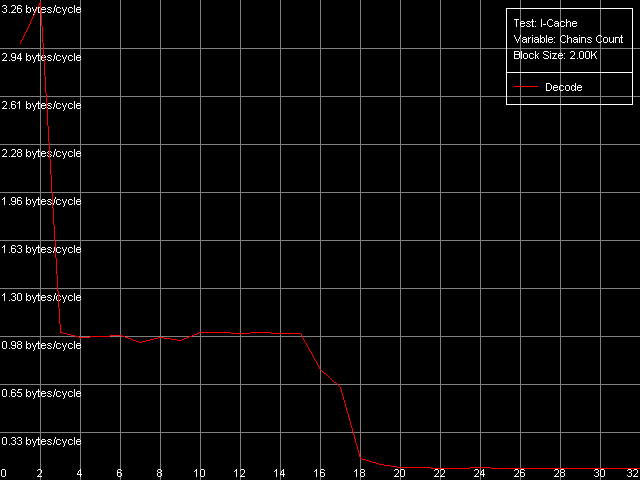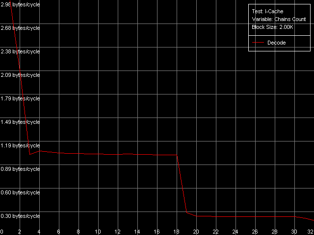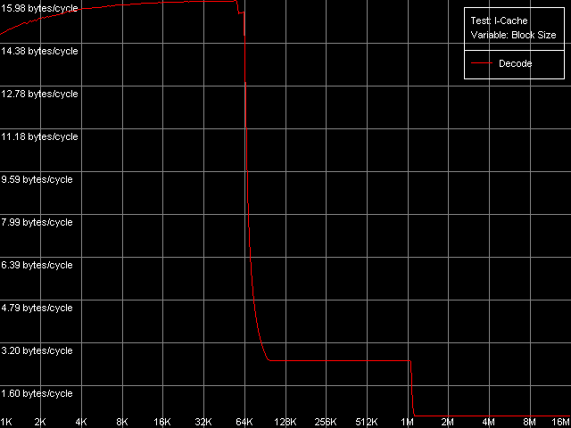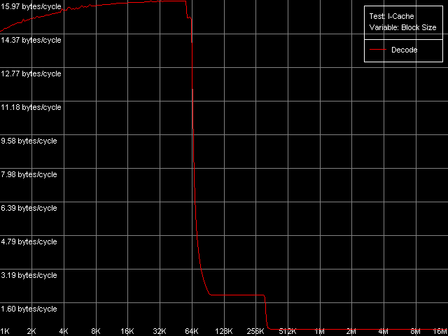 Для начала оценим характеристики уровней кэша инструкций (напомним, что L2 кэш обычно может кэшировать как данные, так и исполняемый код) и эффективность декодирования простой 6-байтной команды cmp eax, 0x00000000, которая позволяет достичь максимальной скорости декодирования. С этой целью воспользуемся тестом I-Cache, выбрав пресет L1i Size / Decode Bandwidth, CMP Instructions 3.