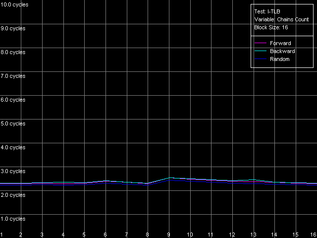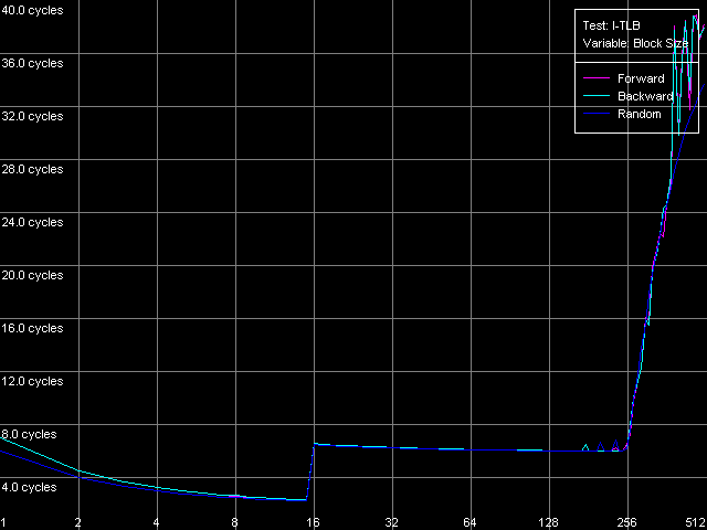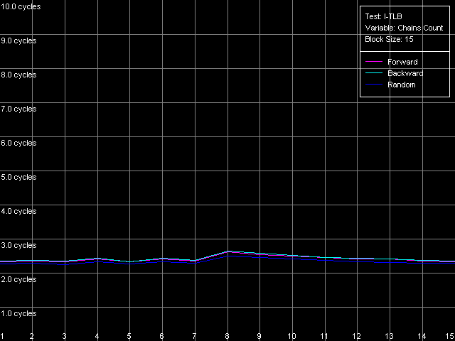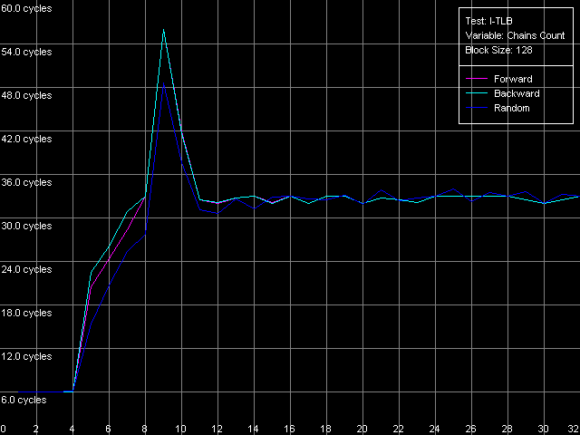 Измерим характеристики I-TLB точно так же, как и D-TLB. Для определения размеры (структуры уровней) I-TLB воспользуемся пресетом I-TLB Size в тесте I-TLB.