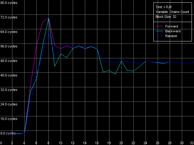 Интерпретация результатов весьма очевидна — L1 I-TLB в обоих случаях является полноассоциативным. Нам остается определить ассоциативность второго уровня TLB инструкций. Для этого используем пресет I-TLB Associativity, 32 Entries для K7 и I-TLB Associativity, 128 Entries для K8.