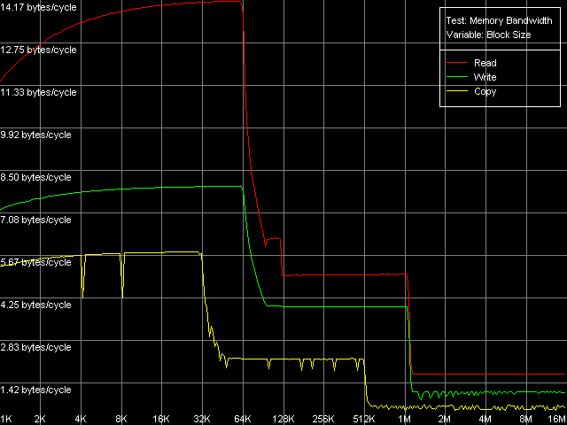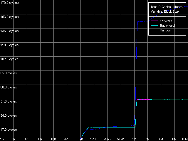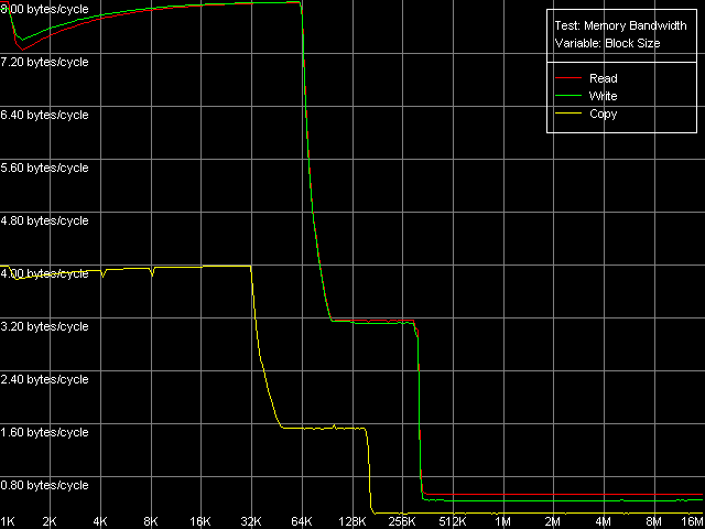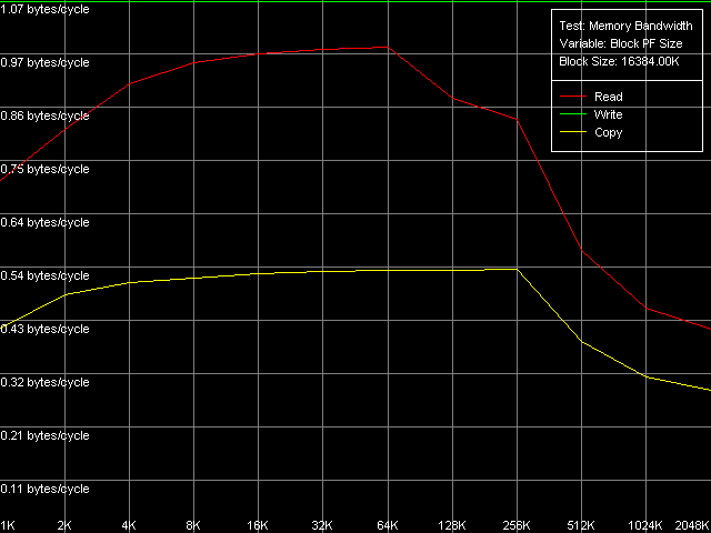 Мы видим, что оба процессора имеют кэш данных первого уровня размером 64 КБ (первый перегиб на кривых Read и Write). Интересной особенностью кривых в обоих случаях является наличие второго перегиба в области, соответствующей суммарному размеру L1+L2 кэшей данных (320 КБ и 1088 КБ, соответственно). Такая особенность является весьма характерным признаком эксклюзивной архитектуры кэша данных процессора (каковой она и является в процессорах семейства AMD K7/K8), в то время как кривые на процессорах с инклюзивной архитектурой (как мы увидим далее) имеют перегибы в областях, соответствующих размерам L1 и L2 (а также L3) кэша.