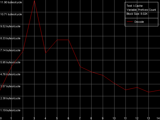 Кривая зависимости на K7 характеризуется максимумом при количестве префиксов, равном трем (11.2 байт/такт / 4 = 2.8 операций/такт), а при увеличении количества префиксов эффективность декодирования (в пересчете на количество операций) сильно снижается. У K8 с «отсечением» префиксов дела обстоят несколько лучше, хотя все равно не так хорошо, как хотелось. Вид кривой несколько изменился, имеются дополнительные максимумы, которые, однако, не являются таковыми при пересчете на количество исполняемых операций. А ведь именно такие команды — [0x66]nNOP — рекомендует AMD в своем руководстве по оптимизации ПО для процессоров семейства K8 в качестве «нейтрального» кода, использующегося например, для выравнивания границы начала цикла.