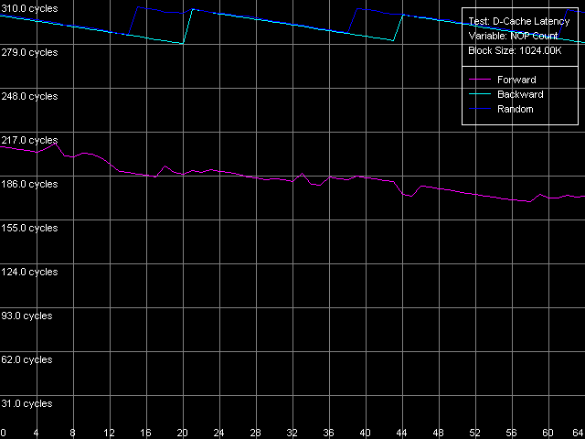 Рассмотрим вид кривых на платформе K7. Увеличение разгрузки шины L2-RAM ведет к плавному уменьшению величины латентности прямого последовательного доступа к памяти. По результатам данного теста нельзя сказать о достижении минимальной величины. Тем не менее, отдельный тест показывает, что она достигается при вставке порядка 380 «NOP»-ов между каждыми последующими обращениями и составляет величину 25-26 тактов процессора. В то же время, кривые обратного последовательного и случайного доступа имеют принципиально иной вид — они характеризуются наличием «зубчиков» со вполне определенной периодичностью. Латентность обратного доступа к памяти находится в интервале 280 — 304 такта (183 — 198 нс), а латентность случайного доступа оказывается лишь незначительно выше (284 — 305 тактов, 185 — 199 нс), поскольку, как было сказано выше, мы измеряли ее в условиях практически полного отсутствия промахов L2 TLB.