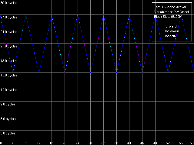 Отметим, что использование смещения второго слова относительно первого, равного 60 байтам, фактически означает, что его реальное смещение составит -4 байта (за исключением начальной точки, когда смещение действительно равно 60 байтам), т.е. второе слово будет располагаться в строке кэша на одну позицию «левее» первого. Теперь рассмотрим сами рисунки. Прежде всего, опровергнем гипотезу о том, что данные всегда считываются с начала строки, независимо от расположения первого элемента. В этом случае, поскольку считывание 2-го элемента в данном тесте осуществляется в таком порядке: (60, 0, 4, ..., 56), мы имели бы вид кривых, идентичный полученному выше, но со смещением всей картины на 4 байта влево. Таким образом, в рассматриваемых архитектурах (K7 и K8) считывание строки кэша может начинаться с некоторой ненулевой позиции, зависящей от расположения первого элемента. Для ответа на вопрос, как именно связаны эти две величины, рассмотрим сам вид полученных кривых. Легко заметить, что они характеризуется всего двумя значениями суммарной латентности — максимумом, равным 26/27 тактам (при смещениях первого слова, кратных восьми, назовем их «четными») и минимумом, равным 14/15 тактам (при «нечетных» смещениях). Иными словами, это означает, что в случае «нечетных» смещений первого слова данные, прибывающие из кэша L2, оказываются в кэше L1 сразу, в то время как считывание данных с «четных» смещений приводит к максимальной задержке прибытия второго слова, отстоящего от первого на -4 байта. На основании полученных результатов сделаем предположение, что считывание строки кэша из L2 в L1 в процессорах семейства AMD K7/K8 может осуществляться с любого смещения, кратного 8 байтам. Далее считывание идет вперед, оборачиваясь на конце строки — пока вся строка не считается полностью. Для проверки этого предположения мысленно рассмотрим два примера. Пусть в первом из них данные запрашиваются с «четного» смещения, равного 24 байтам. Тогда считывание данных из L2 в L1, на каждом такте, будет осуществляться в такой последовательности: (24-31, 32-39, 40-47, 48-55, 56-63, 0-7, 8-15, 16-23). Это объясняет, почему задержка чтения второго слова, имеющего фактическое смещение 24 — 4 = 20 байт, оказывается максимальной (26/27 тактов). Рассмотрим теперь другой случай, когда смещение первого слова оказывается «нечетным», к примеру, 44 байт. Считывание данных, согласно нашему предположению, будет осуществляться так: (40-47, 48-55, 56-63, 0-7, 8-15, 16-23, 24-31, 32-39). Что и объясняет, почему суммарная латентность обращения к элементам, имеющим смещения 44 и 40 байт, соответственно, получилась минимальной (14/15 тактов). А это, в свою очередь, доказывает сделанное выше предположение.