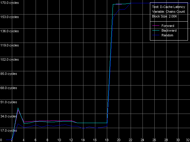 Обратим внимание на то, что величина латентности L2 и RAM в обоих случаях получилась несколько завышенной в этом тесте, особенно при последовательном режиме доступа. Такое увеличение латентности, по всей видимости, связано с возрастанием накладных расходов на постоянную переассоциацию строк кэша со строками памяти по схеме LRU (Least Recently Used), что позволяет «удерживать» в иерархии кэшей процессора все данные, считываемые с «нехороших» адресов с точки зрения организации кэша данных процессора.