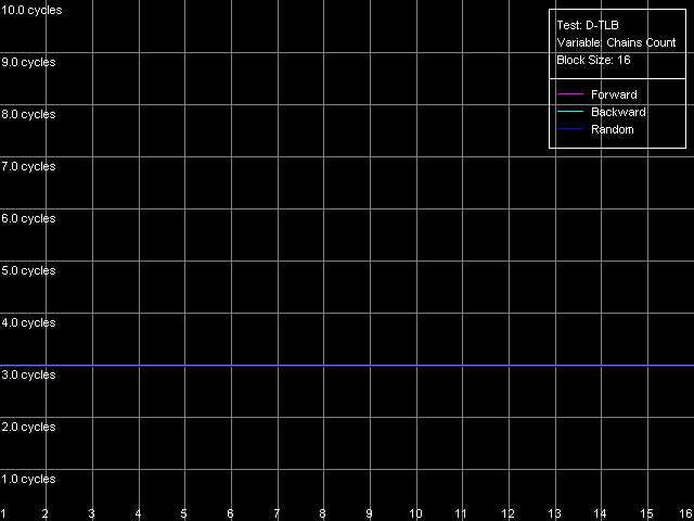Согласно документации AMD, L1 D-TLB в процессорах семейства K7/K8 является полностью ассоциативным (fully associative). Самое время проверить это утверждение. Для этого выберем пресет D-TLB Associativity, 16 Entries, которые заведомо поместятся в L1 D-TLB.