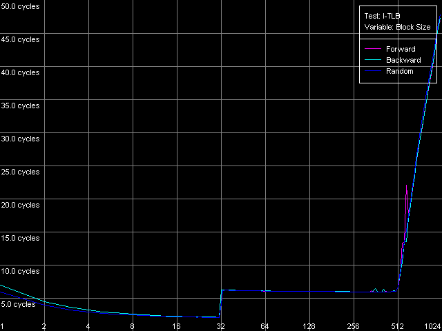 Для платформы Opteron мы вновь немного модифицировали стандартный пресет, увеличив максимальное количество TLB Entries до 1024. Оба процессора, по результатам теста, имеют два уровня I-TLB. Мы видим, что первый уровень (L1 I-TLB) в архитектуре AMD K8 был увеличен вдвое (до 32 записей) по сравнению с архитектурой предыдущего поколения K7. Такие же изменения коснулись и второго уровня L2 I-TLB, размер которого в новой архитектуре был расширен до 512 записей. Тем не менее, оба процессора имеют одинаковую организацию взаимодействия уровней I-TLB, которую, как и в случае с D-TLB, мы условно называем «инклюзивной».