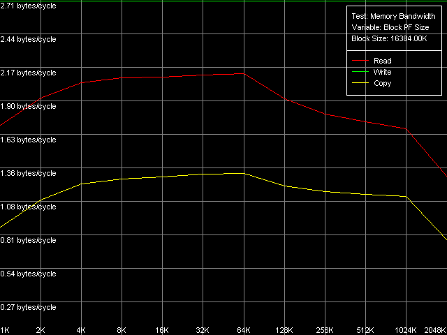 Рассмотрим несколько иной метод предварительного кэширования данных — Block Prefetch 2 (напомним, что отличия методов Block Prefetch между собой мы рассматривали в нашей первой статье). Именно этот метод рекомендуется в руководстве по оптимизации 64-битного ПО для платформы AMD K8 при осуществлении чтения/копирования крупных блоков данных (относительно его применимости касательно 32-битных программ почему-то умалчивается). Посмотрим, насколько хорошо он подходит для рассматриваемых нами платформ (пресет Maximal RAM Bandwidth, Block Prefetch 2, MMX Registers).