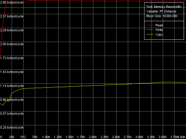 Различия между архитектурами K7/K8 оказываются весьма существенными. Software Prefetch для K7 явно слабоват. Максимальная реальная ПСП на чтение в нашем тесте составляет 1047 МБ/с (при длине префетча 320 байт и выше), что всего лишь в 1.16 раз выше среднего значения. В то же время, выигрыш от использования Software Prefetch на K8 весьма значителен: реальная ПСП на чтение достигает 5150 МБ/с (длина префетча — 640 байт и выше), а это в 1.66 раз выше, чем при обычном чтении данных. За столь хорошую реализацию Software Prefetch инженеров AMD остается только похвалить.
